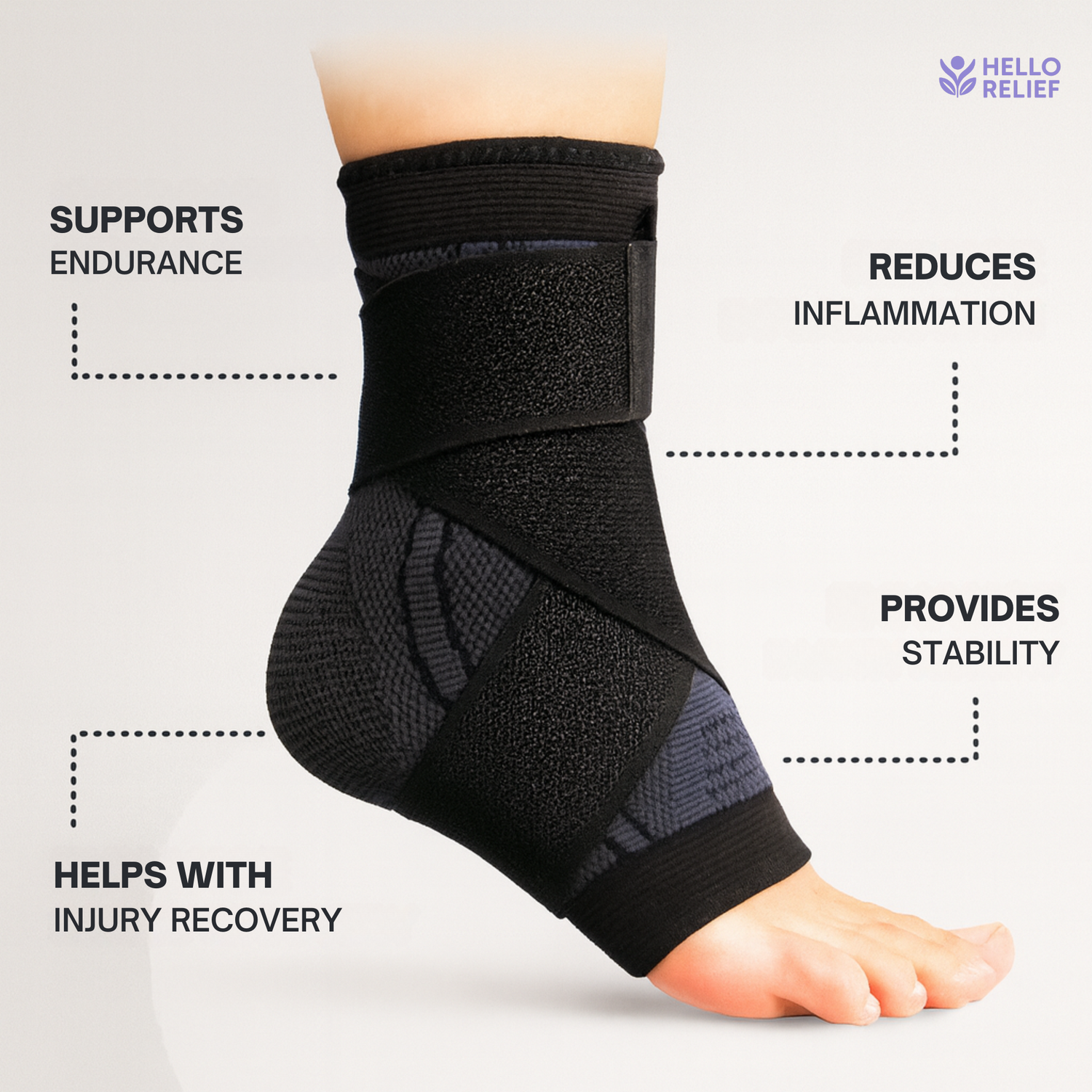 Step into comfort and stability with our Hello Relief Ankle Brace & Foot Compression Support, designed to keep you moving with confidence. Engineered for everyday wear, sports, and recovery, it provides firm yet flexible support that helps reduce pain, swelling, and fatigue. Its breathable, snug-fit design enhances circulation, accelerates healing, and protects against further injury. Whether you have a game of sports, at the gym, at work, or just simply resting at home, this brace supports your ankle so you can stay active and recover faster.